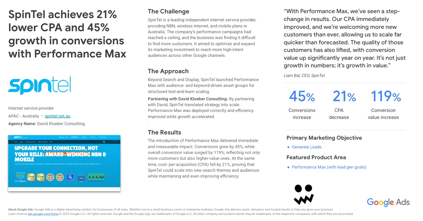 When SpinTel approached me, they were facing a critical growth challenge. As a leading independent internet service provider offering NBN, wireless internet, and mobile plans across Australia, their Google Ads performance campaigns had hit a ceiling.